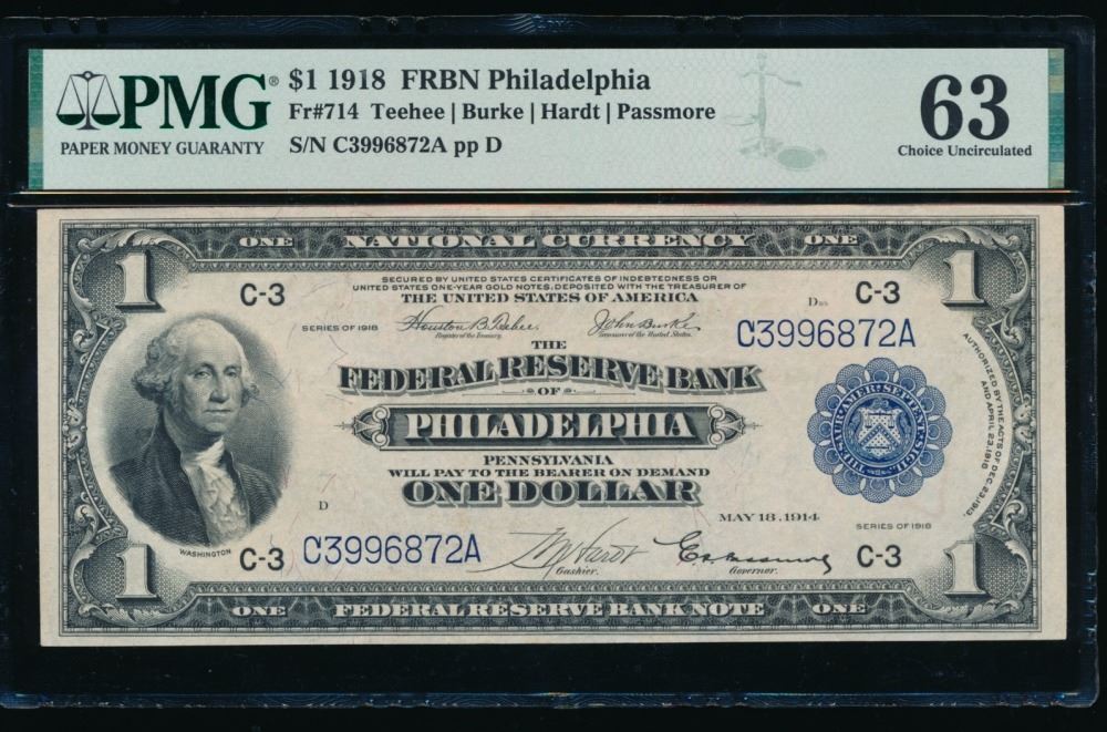 One 1918 $1 Philadelphia FRBN PMG 63.