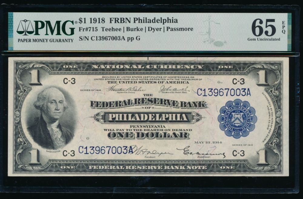 One 1918 $1 Philadelphia FRBN PMG 65EPQ.