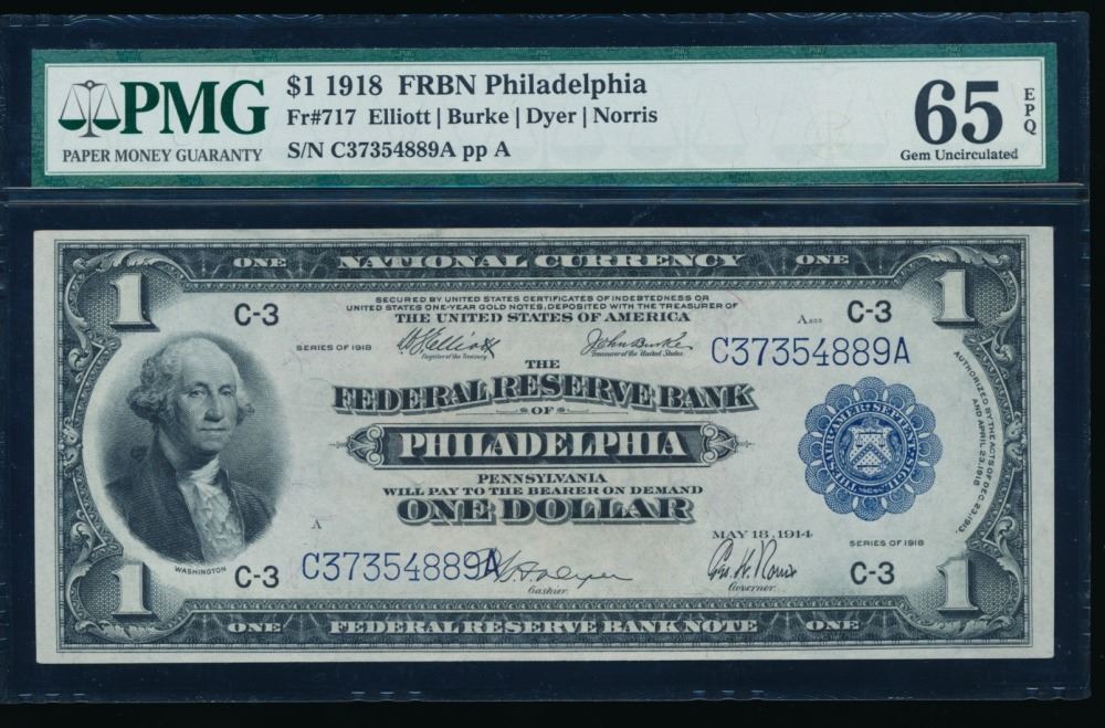 One 1918 $1 Philadelphia FRBN PMG 65EPQ.