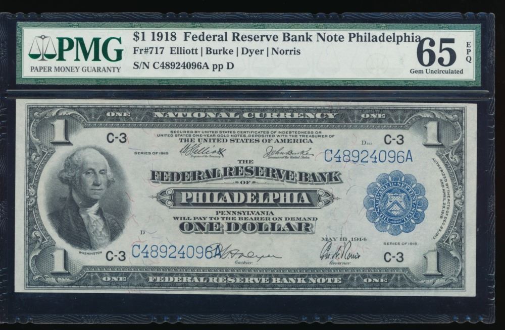 One 1918 $1 Philadelphia FRBN PMG 65EPQ.