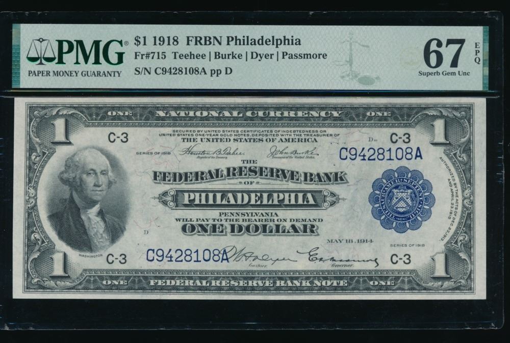 One 1918 $1 Philadelphia FRBN PMG 67EPQ.