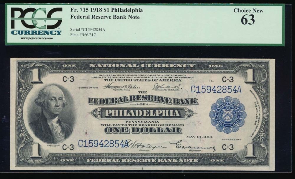 One 1918 $1 Philadelphia Federal Reserve Bank Note PCGS 63.