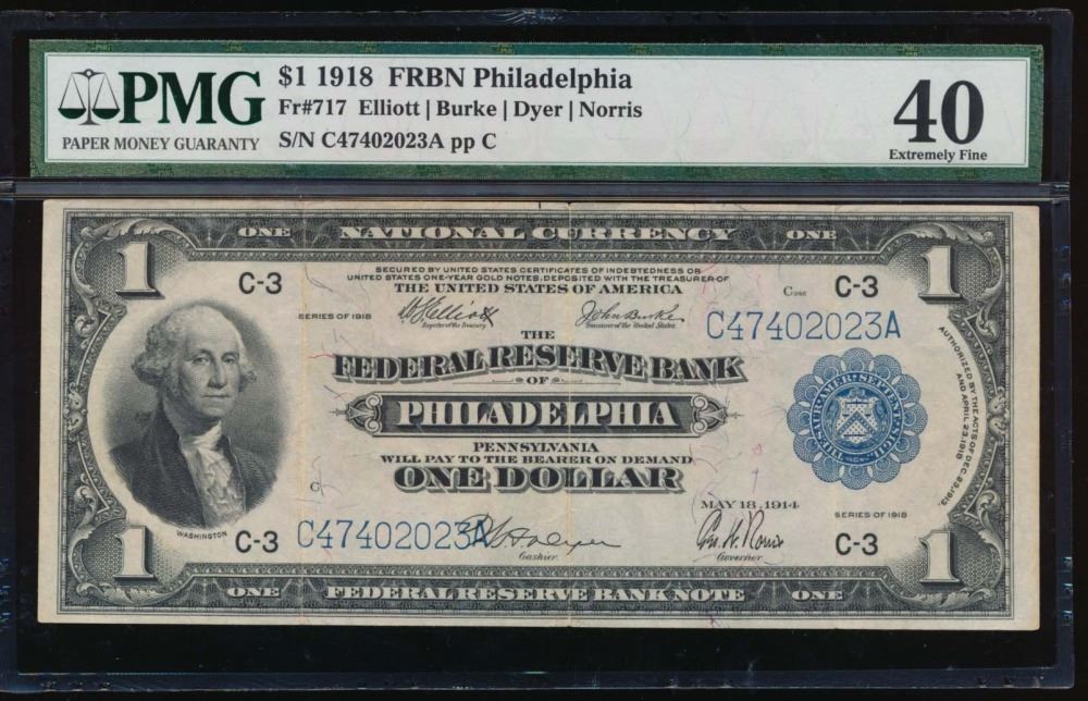 One 1918 $1 Philadelphia Federal Reserve Bank Note PMG 40.