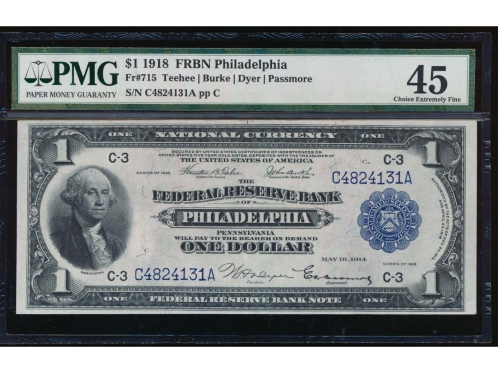 One 1918 $1 Philadelphia Federal Reserve Bank Note PMG 45.