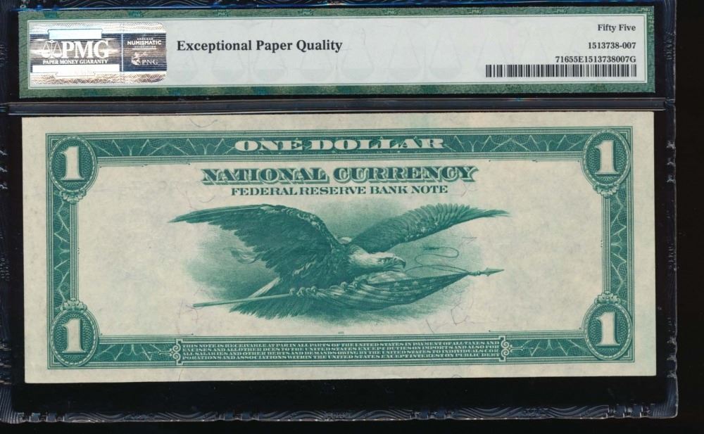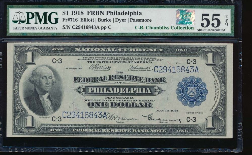 One 1918 $1 Philadelphia Federal Reserve Bank Note PMG 55EPQ.