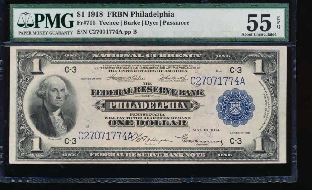 One 1918 $1 Philadelphia Federal Reserve Bank Note PMG 55EPQ.