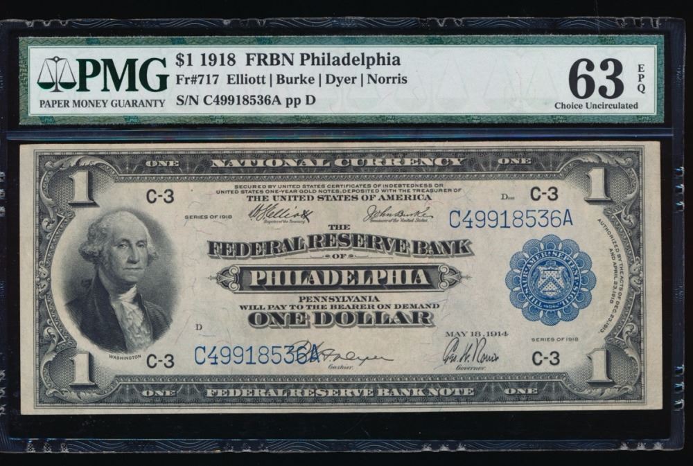 One 1918 $1 Philadelphia Federal Reserve Bank Note PMG 63EPQ.