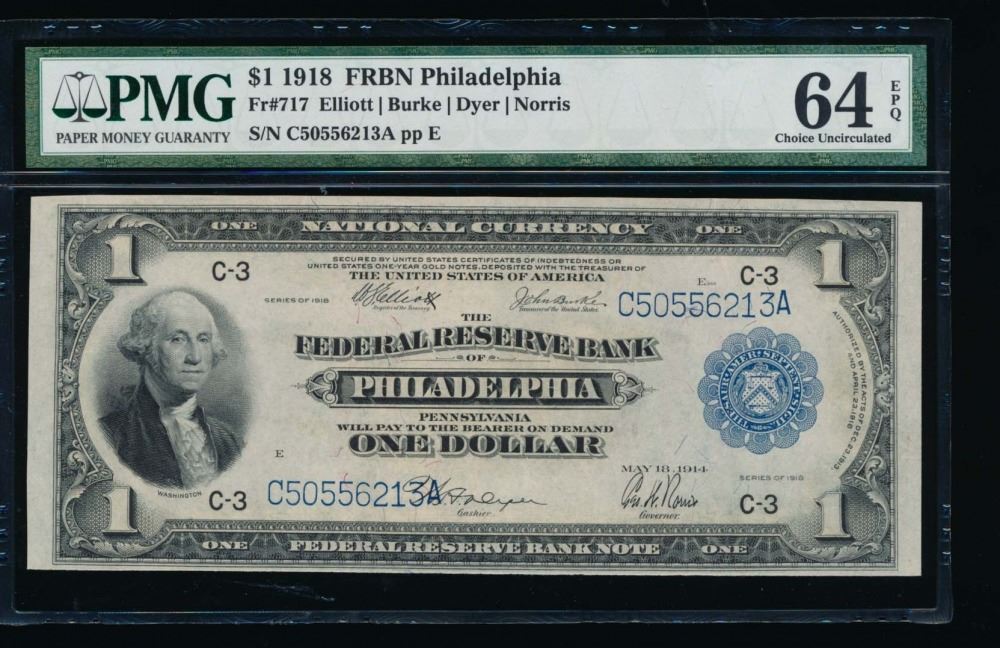One 1918 $1 Philadelphia Federal Reserve Bank Note PMG 64EPQ.