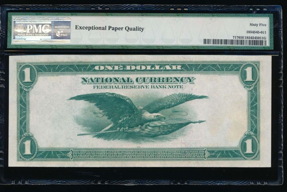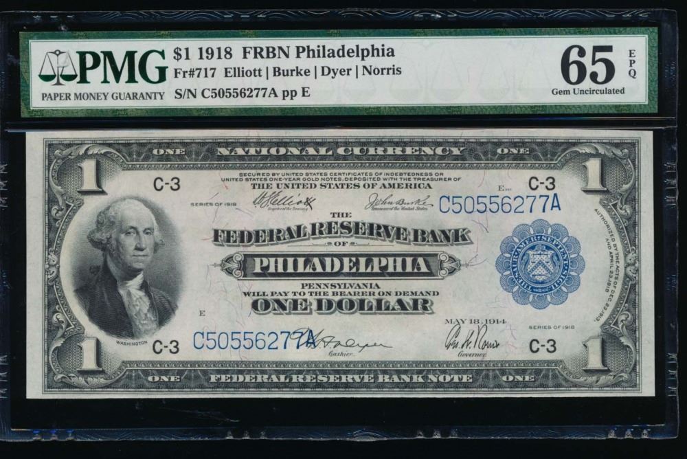 One 1918 $1 Philadelphia Federal Reserve Bank Note PMG 65EPQ.