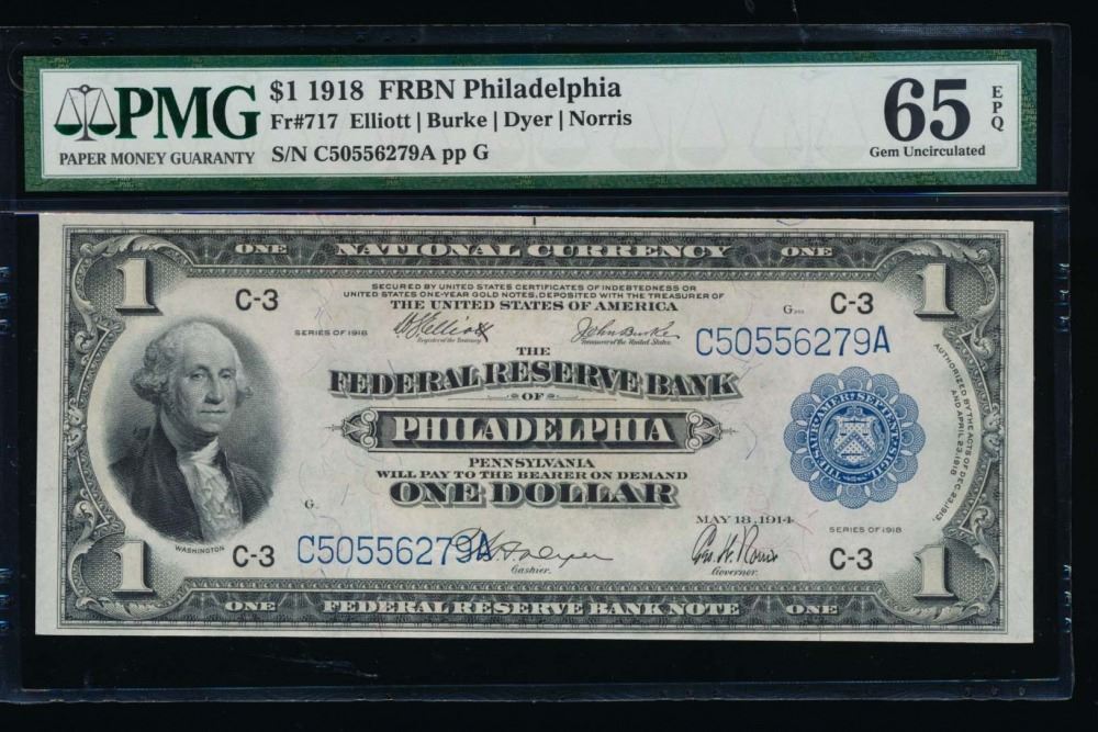 One 1918 $1 Philadelphia Federal Reserve Bank Note PMG 65EPQ.
