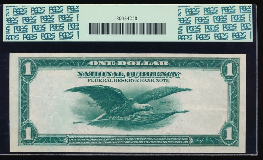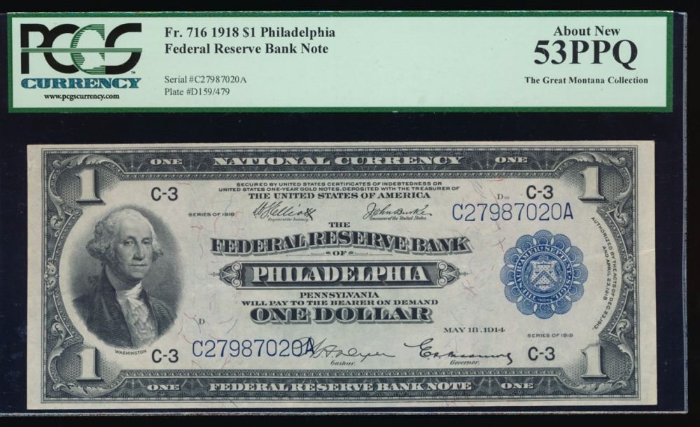 One 1918 $1 Philadelphia Large Federal Reserve Bank Note PCGS 53PPQ.
