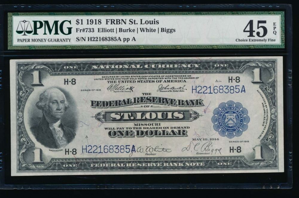 One 1918 $1 St Louis Federal Reserve Bank Note PMG 45EPQ.