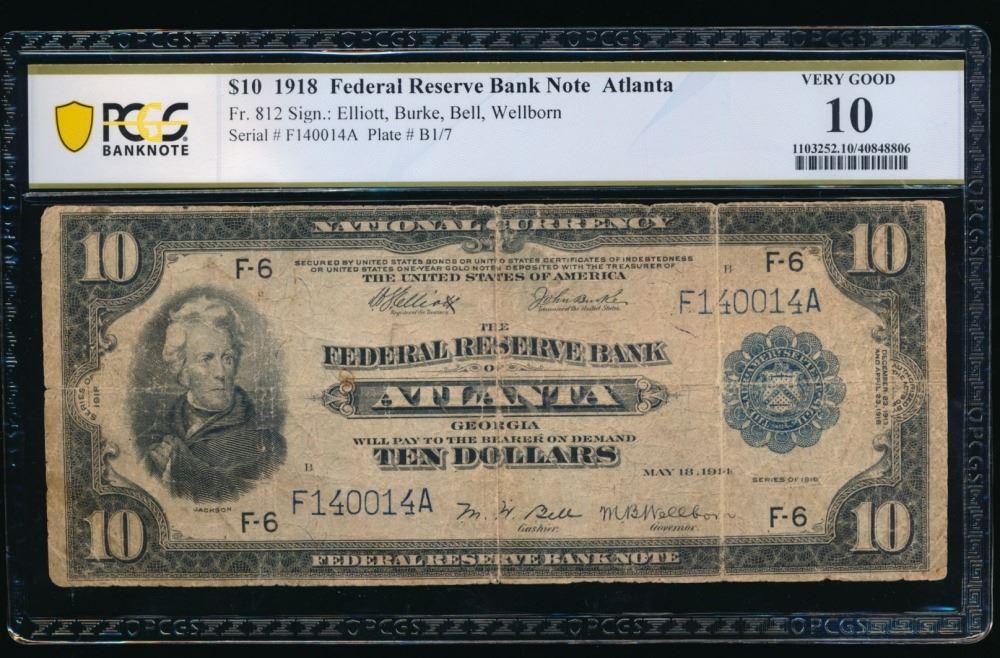 One 1918 $10 Atlanta FRBN PCGS 10.