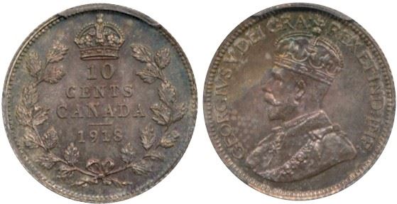 1918 10¢ PCGS MS67. Pristine lustrous issue under red and greens. Absolute stunning issue. An absolute knock out coin with green and golden tones. Near FLAWLESS! One of the nicest George V Ten Cent Silver we have handled in over 33 years. This coin presents an important opportunity for Registry Set collectors. Expect strong bidding.