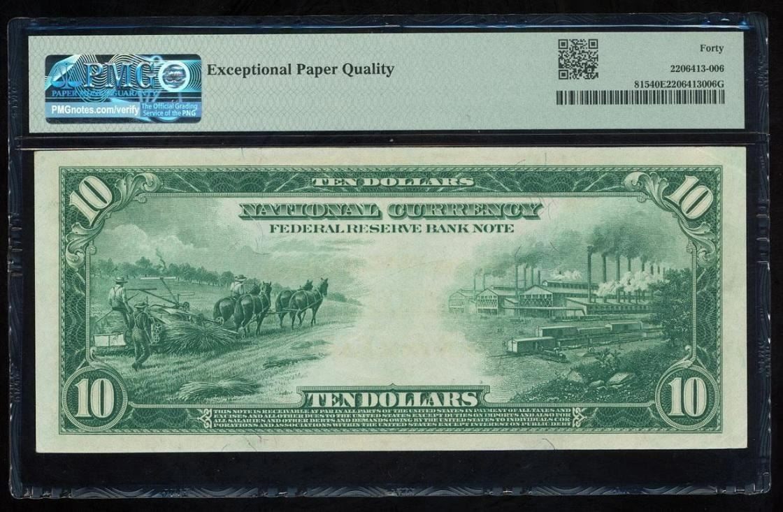 One 1918 $10 St Louis FRBN PMG 40EPQ.