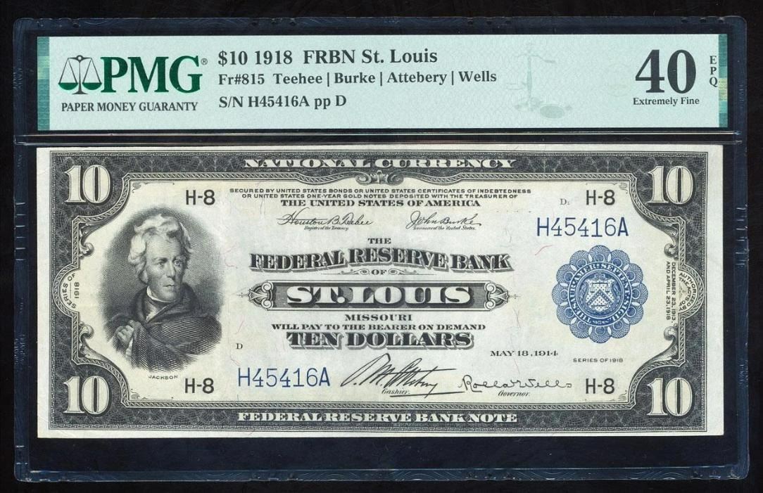 One 1918 $10 St Louis FRBN PMG 40EPQ.