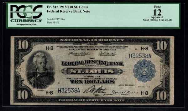 One 1918 $10 St Louis Federal Reserve Bank Note PCGS 12.