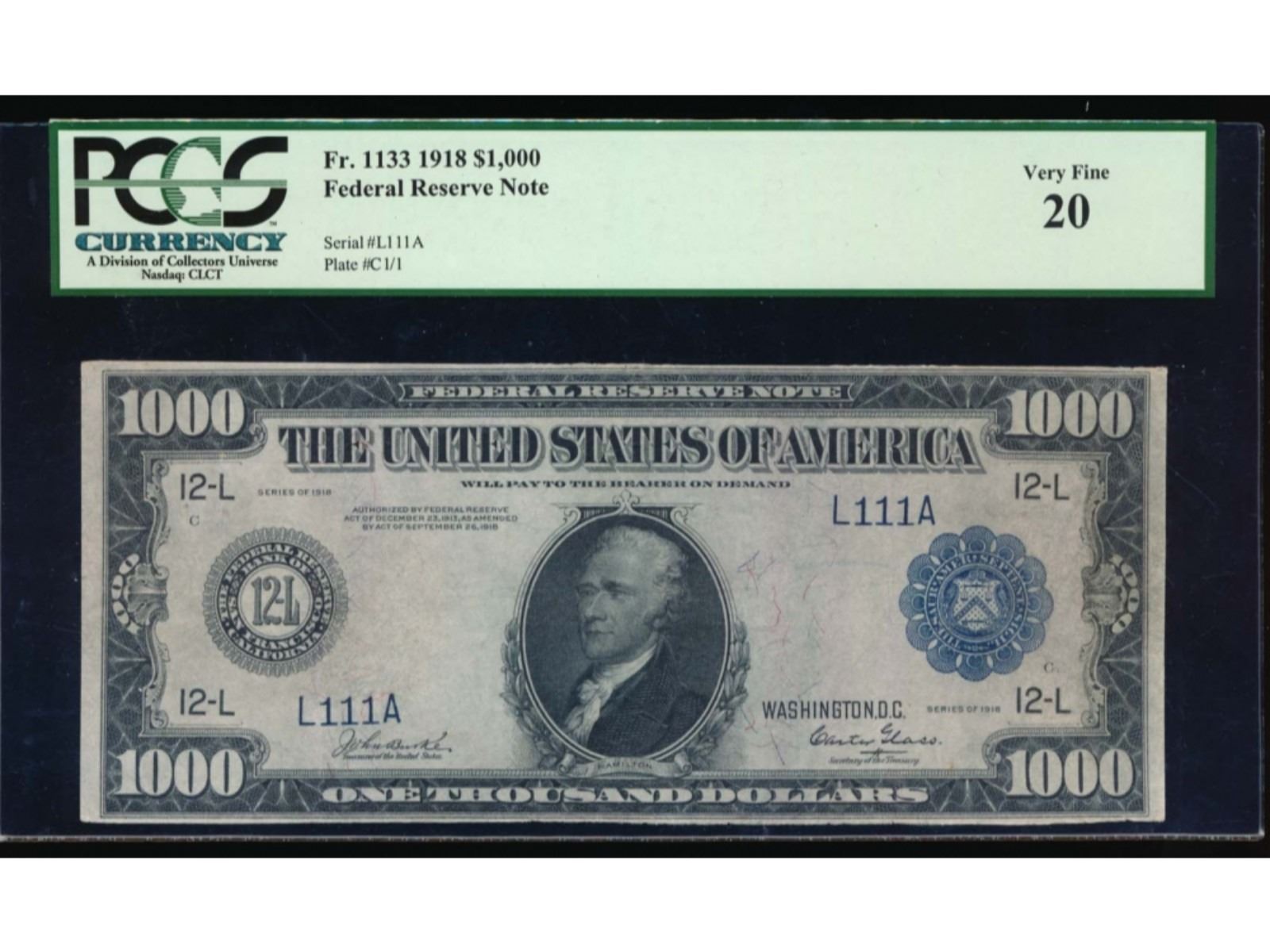 One 1918 $1000 San Francisco Federal Reserve Note PCGS 20 Very Fine.