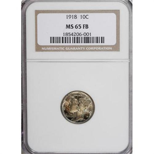 <B>1918 10C MS65 Full Bands NGC.</B></I> David Lange (2005), discussing the 1918 issue, writes that "Mint State coins are generally available, though most are weakly struck around their peripheries." Not so this Gem! The sharp strike transcends the Full Bands to encompass all of the design elements, including those on the peripheries. Splashes of golden-tan, crimson, and forest-green visit highly lustrous surfaces that are devoid of significant marks. Census: 54 in 65 Full Bands, 16 finer (5/07).<BR><BR><b>Shipping:</b> Coins & Currency (<a target="_blank" href="http://www.heritageauctions.com/common/shipping.php">view shipping information</a>)