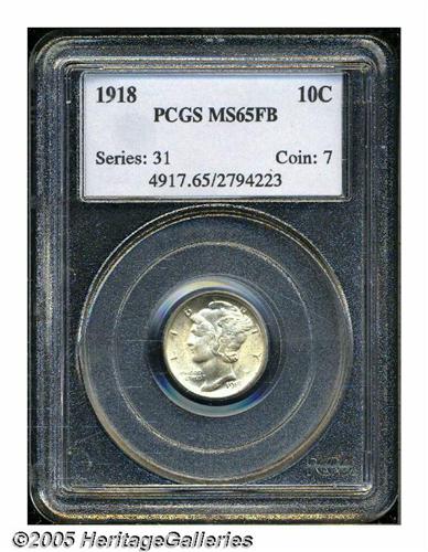 <B>1918<10C> MS65 Full Bands PCGS.</B></I> Lustrous and lightly toned. An excellent type coin from the third year of production for the Mercury Dime series. Population: 79 in 65 Full Bands, 36 finer (6/05).