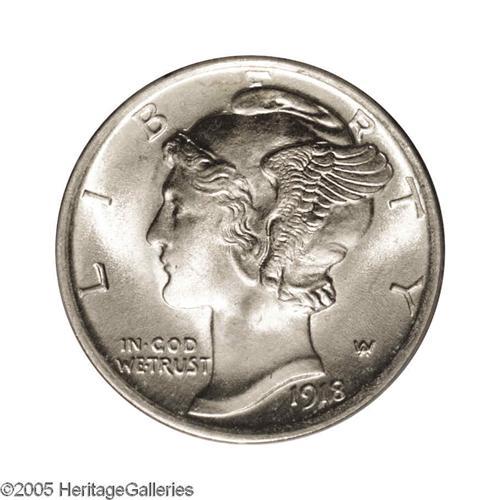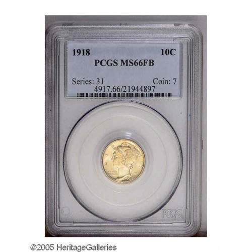 <B>1918<10C> MS66 Full Bands PCGS.</B></I> A difficult early P-mint Dime to locate in high grade. This is a superlative example that has creamy-white surfaces and no abrasions to interrupt the flow of luster. Brilliant and fully struck throughout with virtually none of the peripheral weakness often seen on this issue. Population: 32 in 66, 4 finer (11/05).