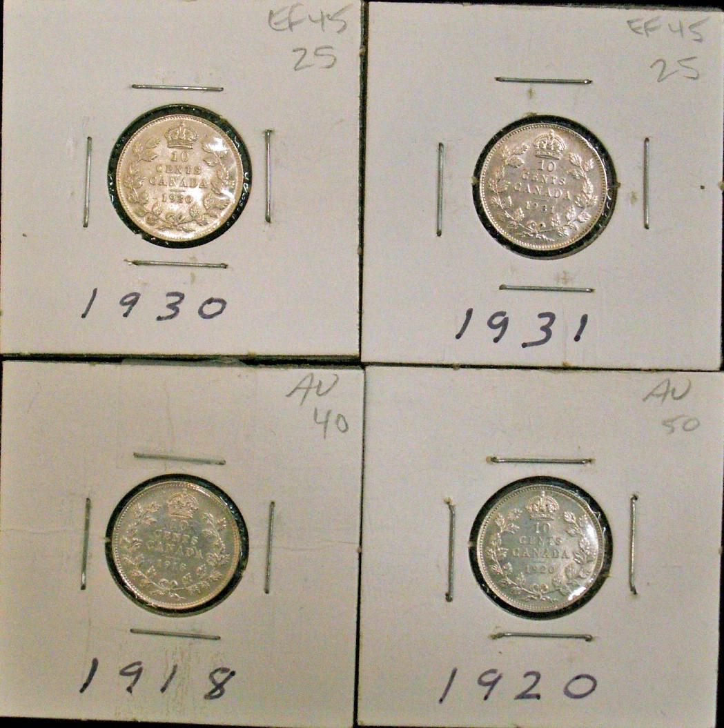 1918, 1920, 1930 & 1931 10¢. Lot of 4 coins all EF-40 white with lustre.