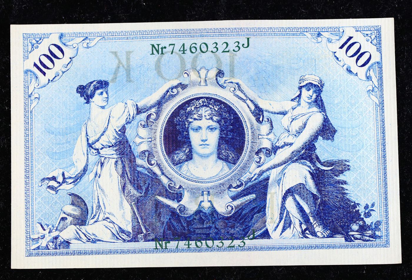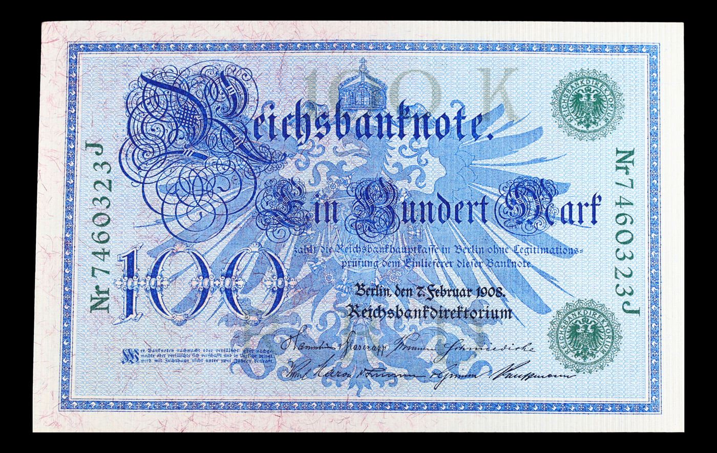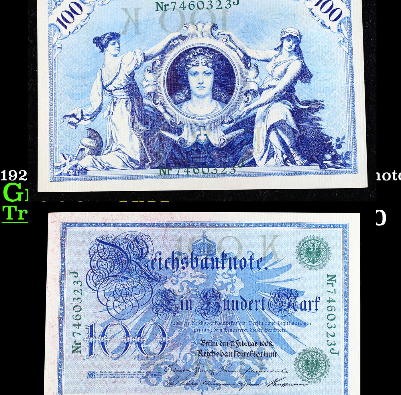 1918-1922 (1908 Issue) Germany 100 Marks Banknote P# 34 Grades Select CU. In the early 1920s, post-WWI Germany saw its economy spiraling out of control. Hyperinflation started directly after the war in 1918, but truly took over the Weimar Republic from 1921 to 1923. The value of the Mark declined incredibly rapidly. 1 USD was equal to 50 German Marks at the beginning of 1920. Toward the end of 1923, 1 USD was equal to over 4,200,000,000,000 German Marks. At times, denominations of the Mark became less valuable than the paper and labor to print it almost immediately after printing. Thus, denominations of the Mark notes became incredibly large, ending up in the tens of trillions.