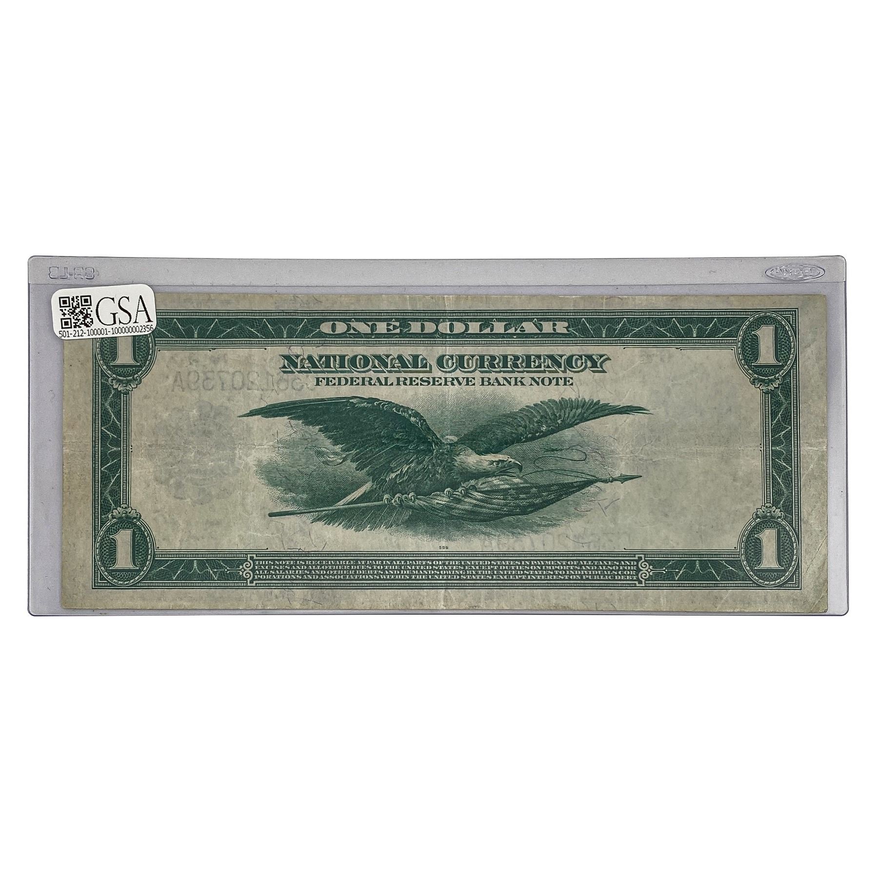 f. Notes sold referencing a third-party grading service are sold “AS IS” without any express or implied warranty, except for guarantee by GSA that they are genuine. Grading, condition or other attributes of any Product may have a material effect on its value and the opinion of others, including third-party grading services such as PCGS Currency and PMG may differ with that of GSA. GSA shall not be bound by any prior or subsequent opinion, determination, or certification by any grading service. Bidders specifically waive any claim to right of return of any Product because of the opinion, determination, or certification, or lack thereof, by any grading service. Certain warranties may be available from the grading services and Bidders are referred to them for further details: Paper Money Guaranty (PMG), PO Box 4711, Sarasota, FL 34230; PCGS Currency, PO Box 10470, Peoria, IL 61612-0470; PCGS Gold Shield, PO Box 9458, Newport Beach, CA 92658. Third-party graded notes are not returnable for any reason whatsoever.