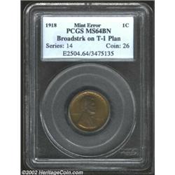 1918 1C Cent--Broadstruck on a Type One Planchet--MS64 Brown PCGS. Well centered with generous amoun