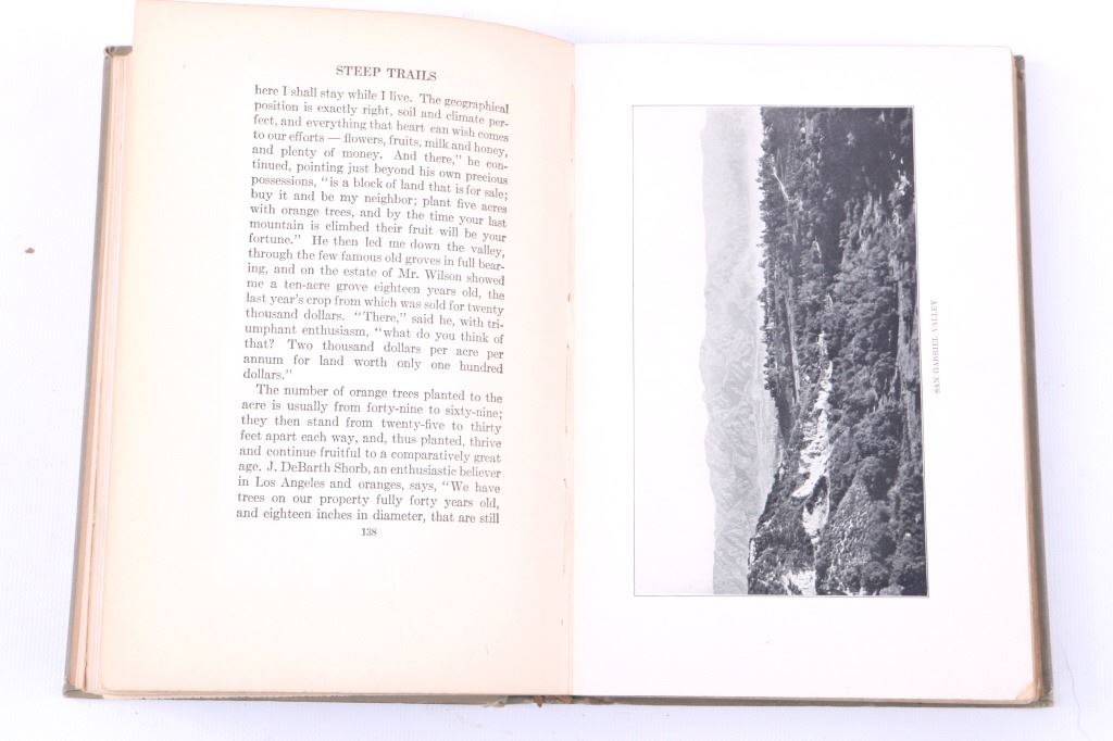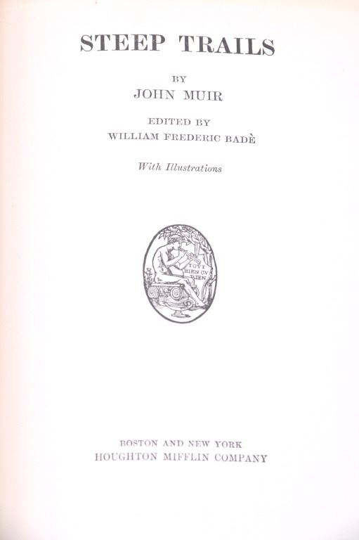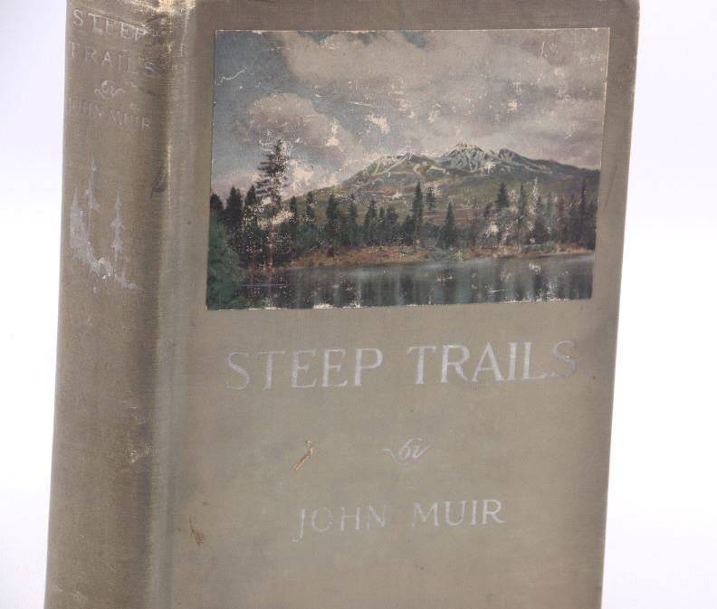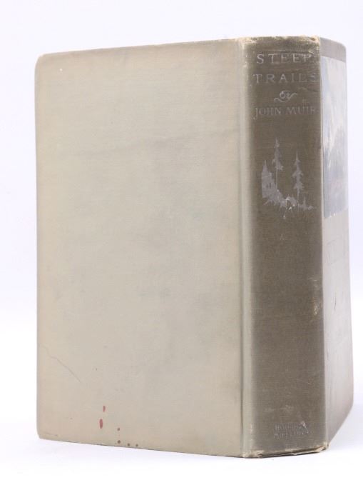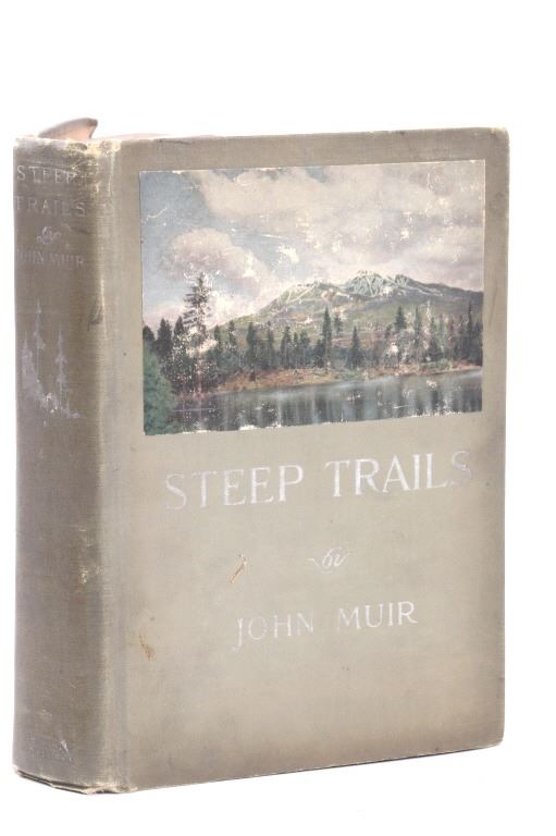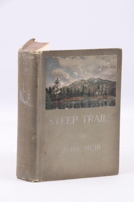Featured in this lot is this 1918 first edition of “Steep Trail” by John Muir. The book was published by Boston and New York Houghton Mifflin Company in 1918. Muir was a Scottish-American naturalist who campaigned extensively for the preservation of America's wilderness lands. He co-founded the Sierra Club and is often referred to as the "Father of the National Parks". The book is a compilation of accounts and stories of Muir's adventures from 1873 up till 1902, recounting his travels across the American West. This hardcover book contains 12 illustrations throughout the piece showing landscapes and scenes. The book shows a sage green cover with white lettering along the cover and spine and an image of a lake with mountains rising in the background. The condition of this book is good, with wear to the cover of the book, a weak inside spine, and light browning to the pages consistent with the age of this book. The measurements of this book are 8 3/8" x 5 3/4".