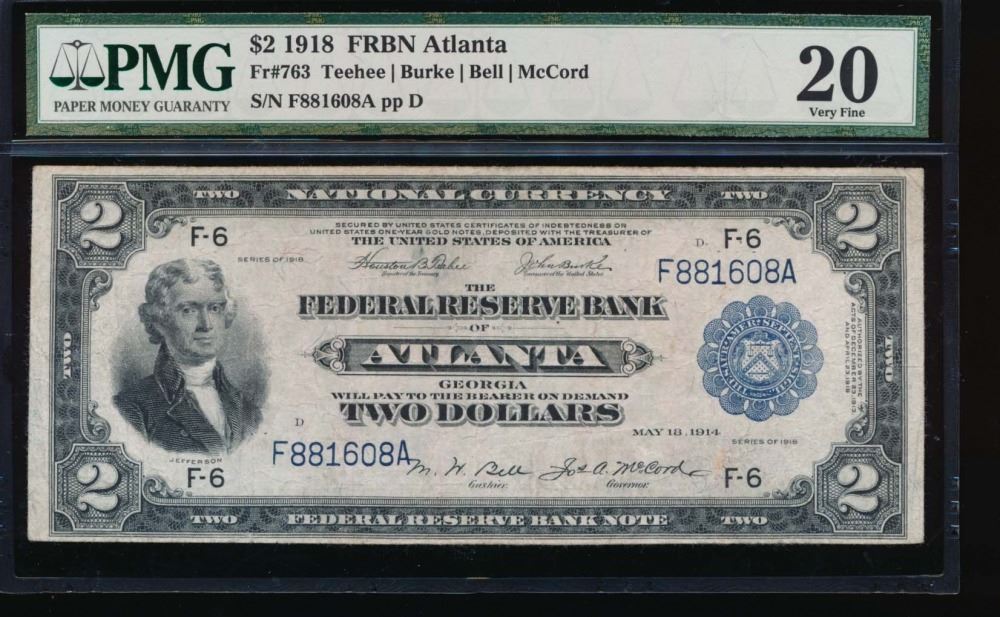One 1918 $2 Atlanta Federal Reserve Bank Note PMG 20.