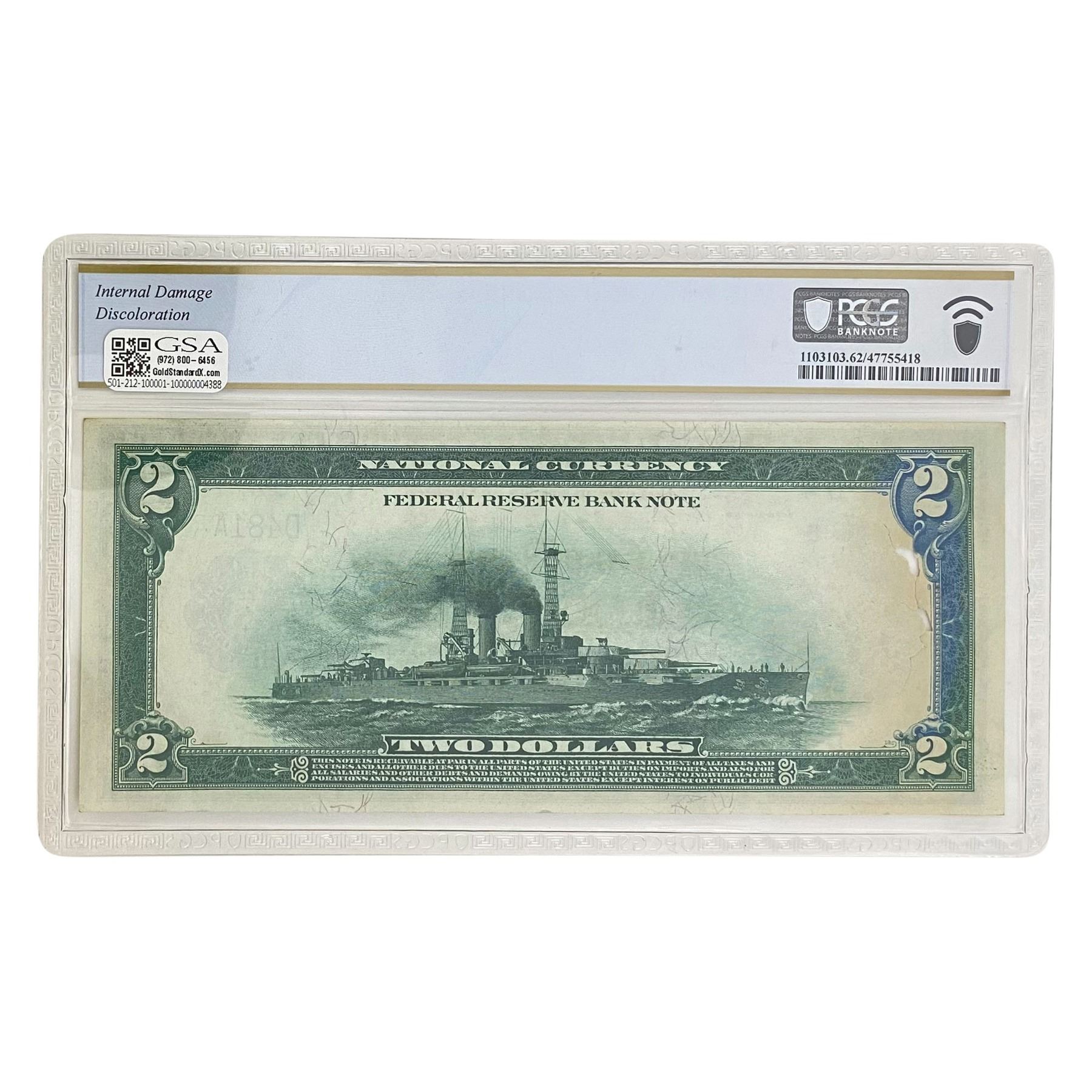 f. Notes sold referencing a third-party grading service are sold “AS IS” without any express or implied warranty, except for guarantee by GSA that they are genuine. Grading, condition or other attributes of any Product may have a material effect on its value and the opinion of others, including third-party grading services such as PCGS Currency and PMG may differ with that of GSA. GSA shall not be bound by any prior or subsequent opinion, determination, or certification by any grading service. Bidders specifically waive any claim to right of return of any Product because of the opinion, determination, or certification, or lack thereof, by any grading service. Certain warranties may be available from the grading services and Bidders are referred to them for further details: Paper Money Guaranty (PMG), PO Box 4711, Sarasota, FL 34230; PCGS Currency, PO Box 10470, Peoria, IL 61612-0470; PCGS Gold Shield, PO Box 9458, Newport Beach, CA 92658. Third-party graded notes are not returnable for any reason whatsoever.