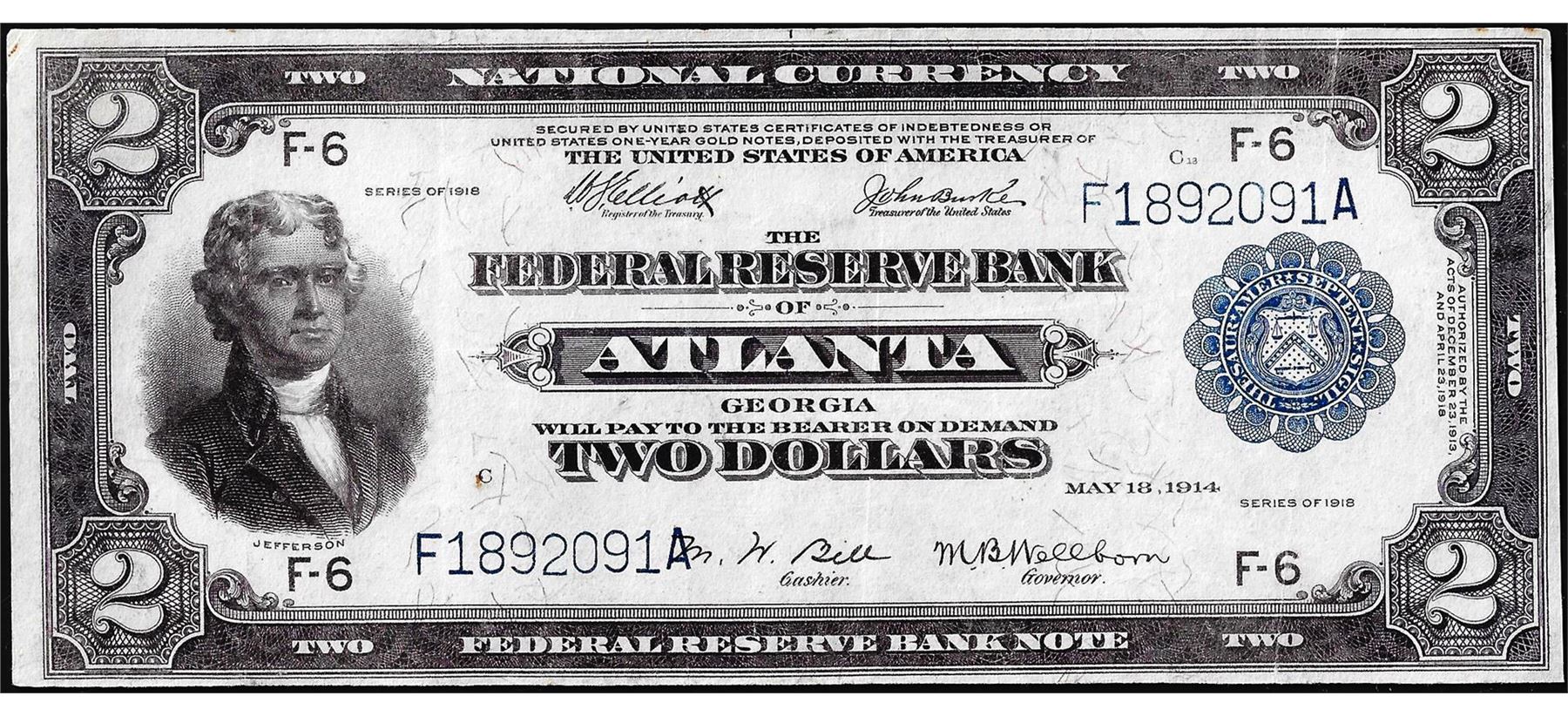 One 1918 $2 Battleship Federal Reserve Bank Note Atlanta Fr.764.