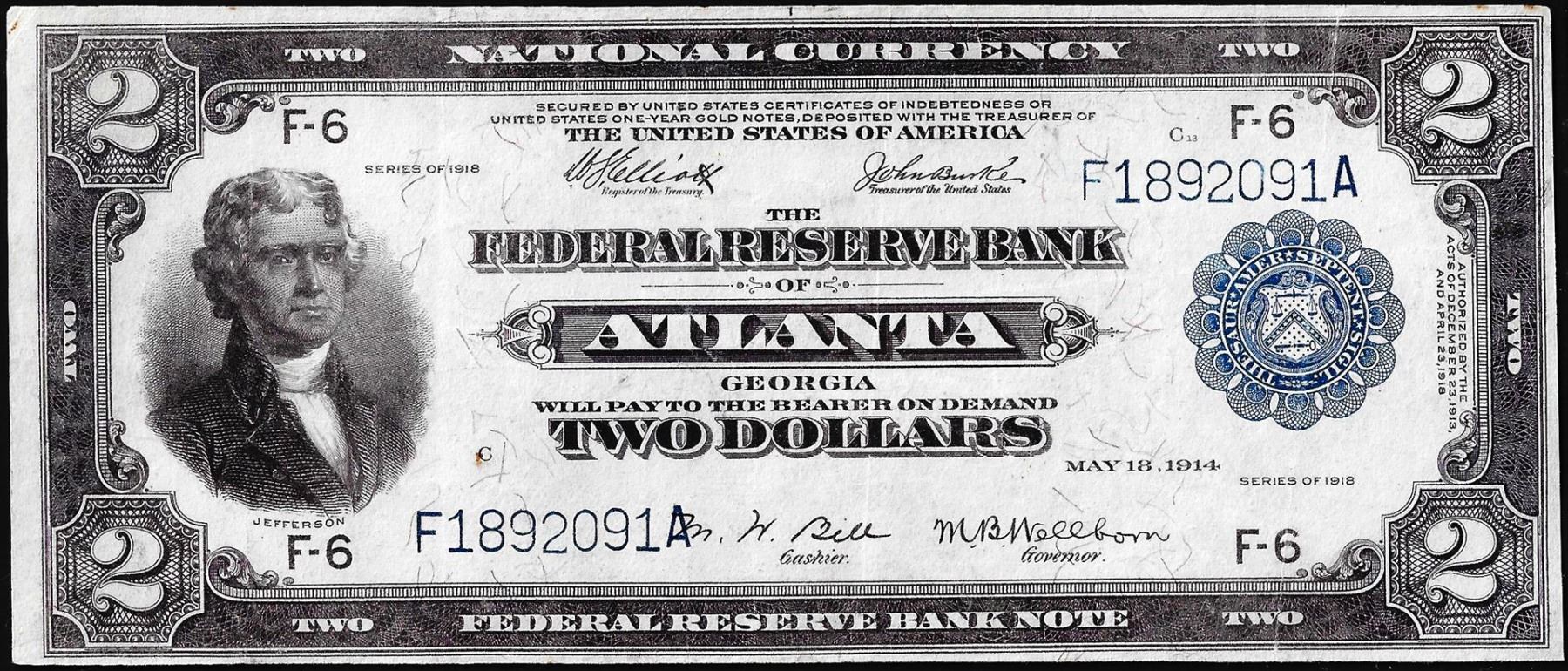 One 1918 $2 Battleship Federal Reserve Bank Note Atlanta Fr.764.