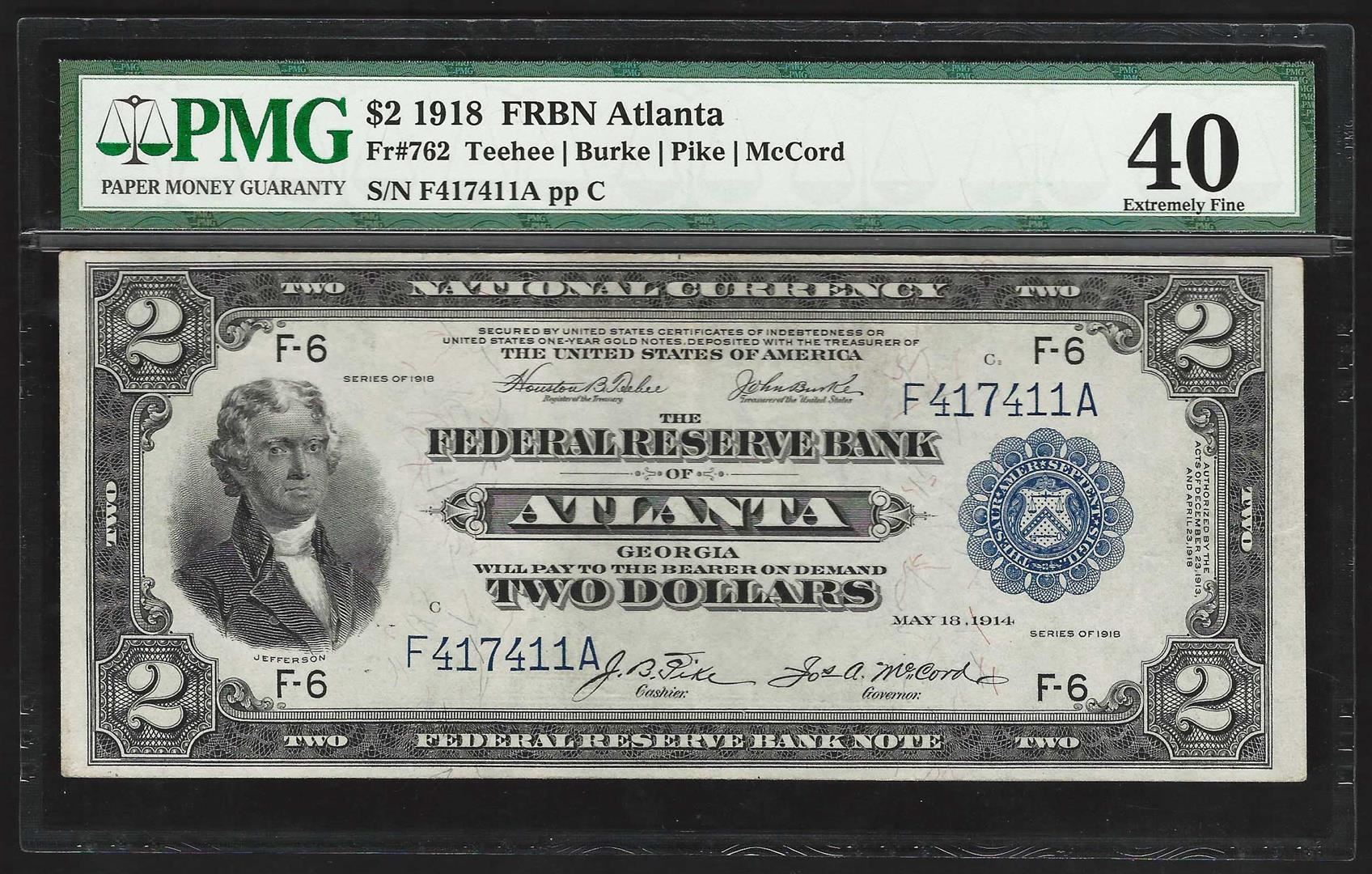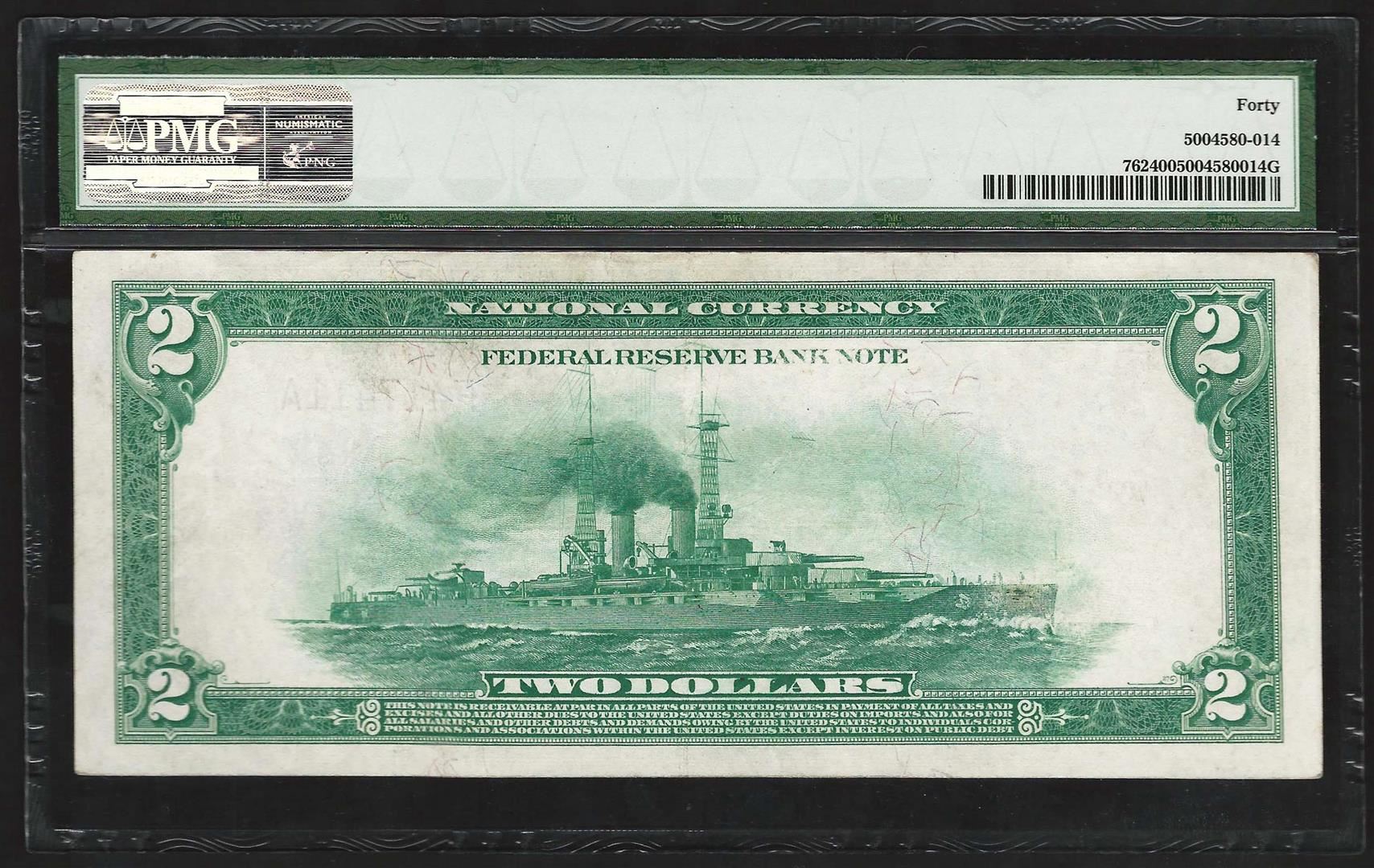 One 1918 $2 Battleship Federal Reserve Bank Note Atlanta PMG Extremely Fine 40. PMG Certified.