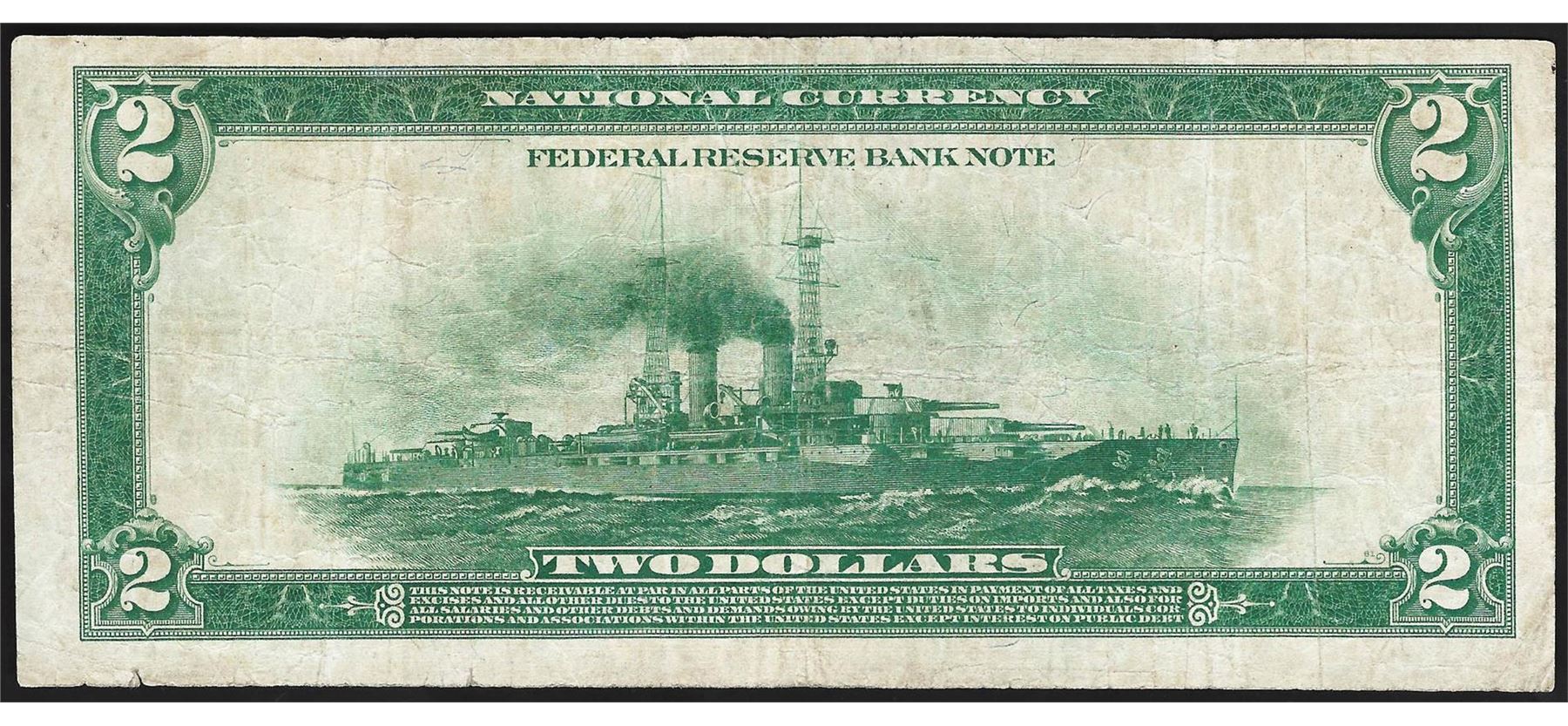 One 1918 $2 Battleship Federal Reserve Bank Note Chicago.