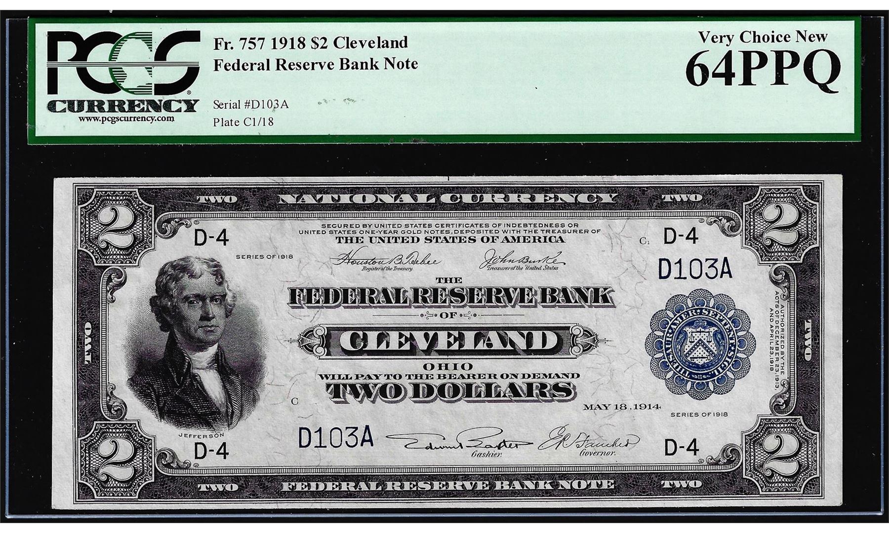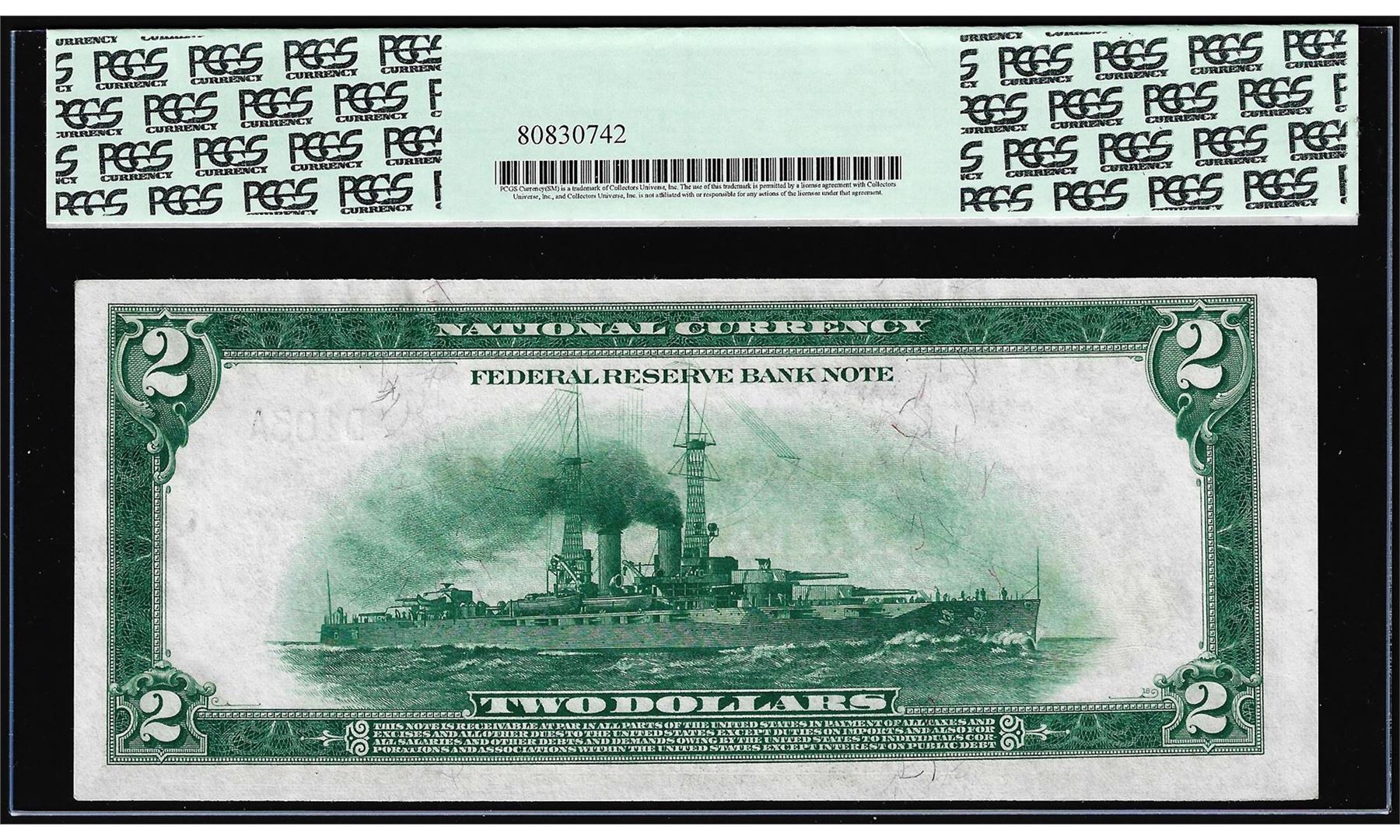 One 1918 $2 Battleship Federal Reserve Bank Note Cleveland Fr.757 PCGS Choice New 64PPQ. PCGS Graded.