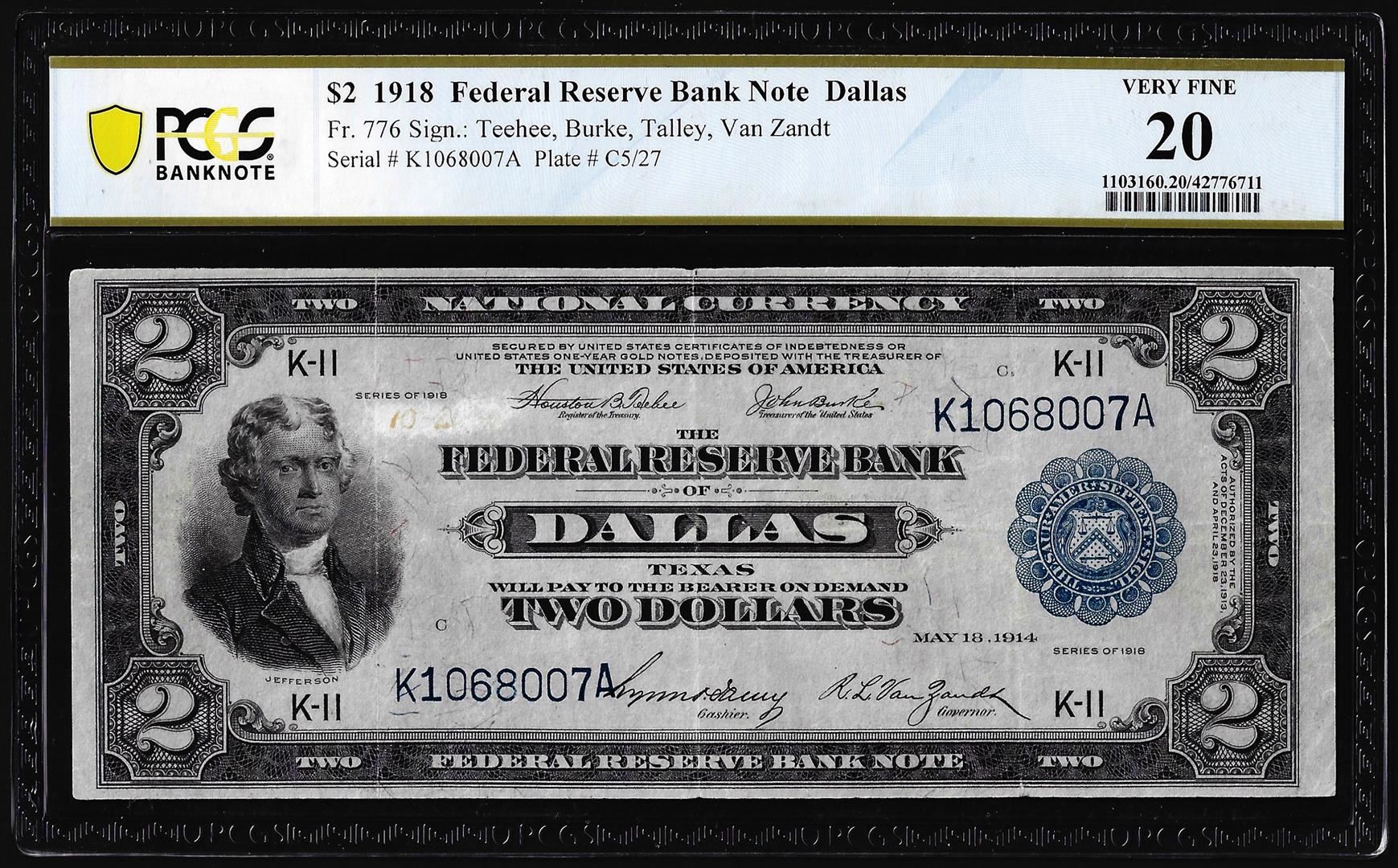 One 1918 $2 Battleship Federal Reserve Bank Note Dallas Fr.776 PCGS Very Fine 20. PCGS Graded.