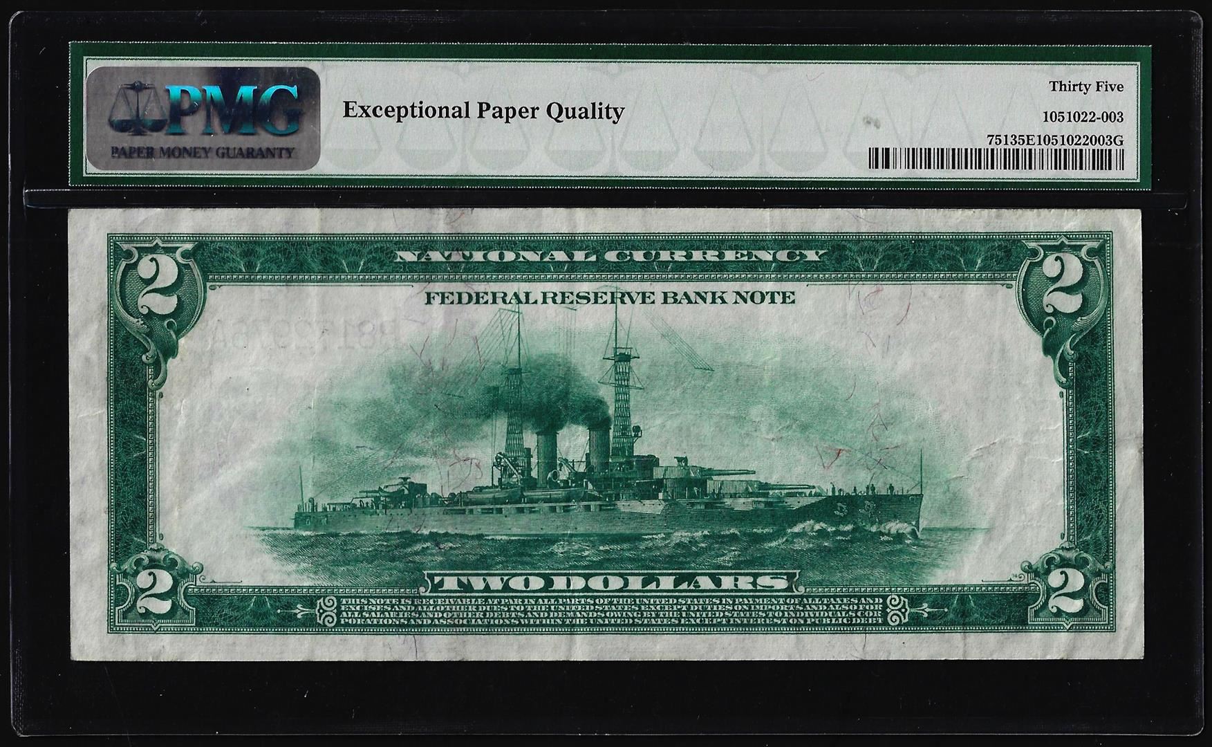 One 1918 $2 Battleship Federal Reserve Bank Note New York Fr.751 PMG Ch. Very Fine 35EPQ. PMG Certified.