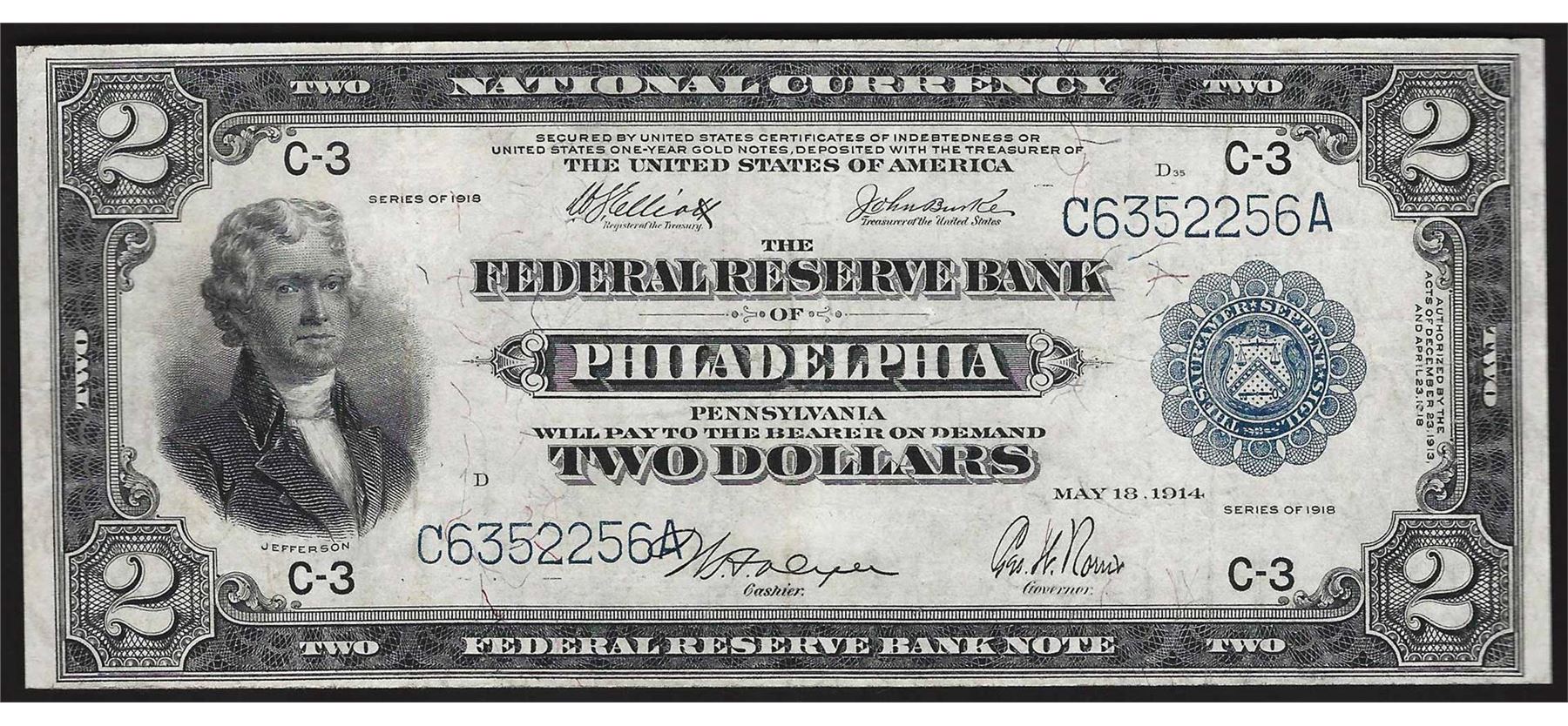 One 1918 $2 Battleship Federal Reserve Bank Note Philadelphia.