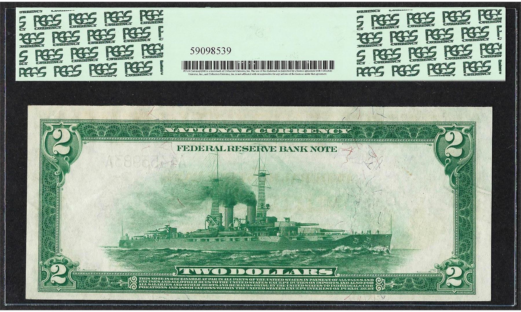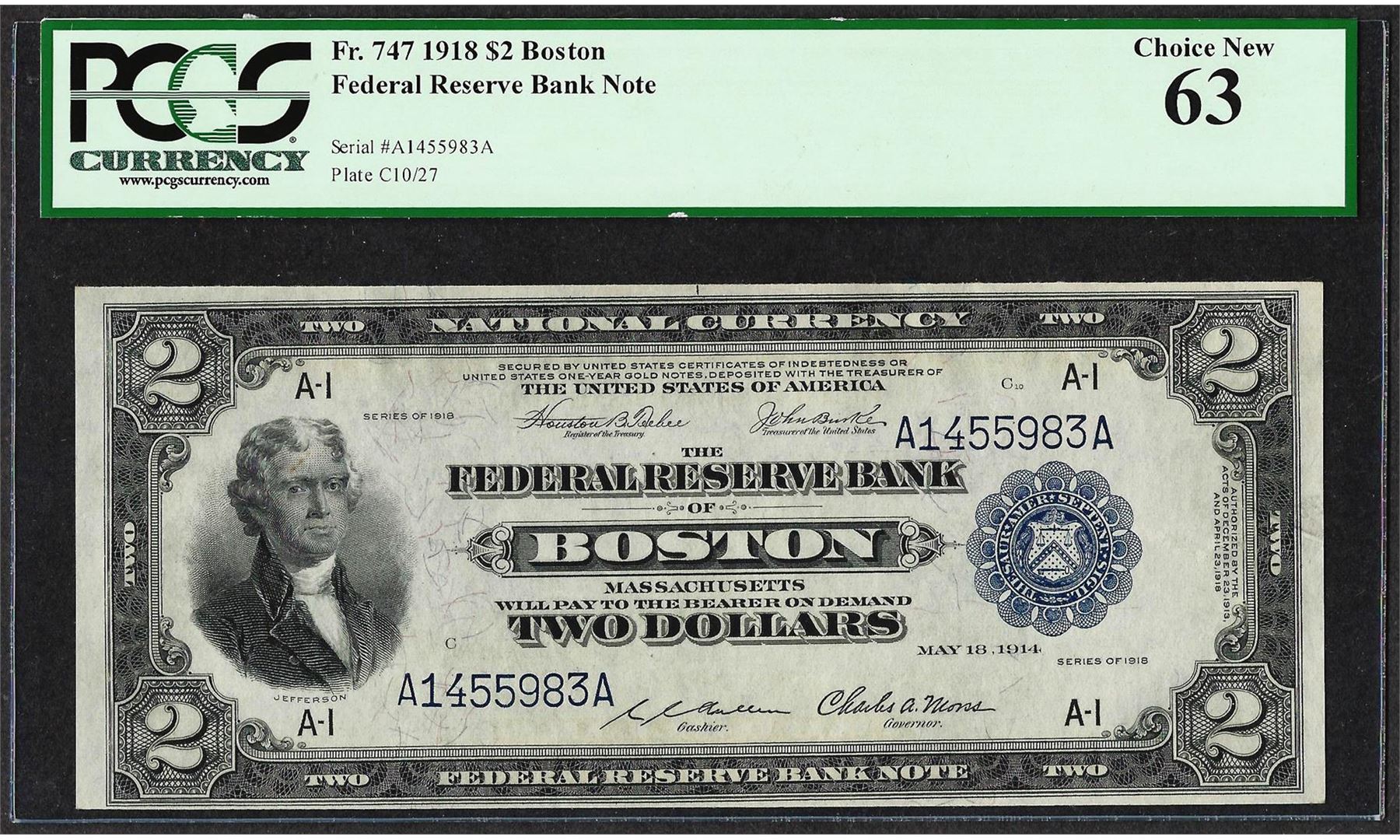 One 1918 $2 Battleship Federal Reserve Bank of Boston Fr.747 PCGS Choice New 63. PCGS Graded.