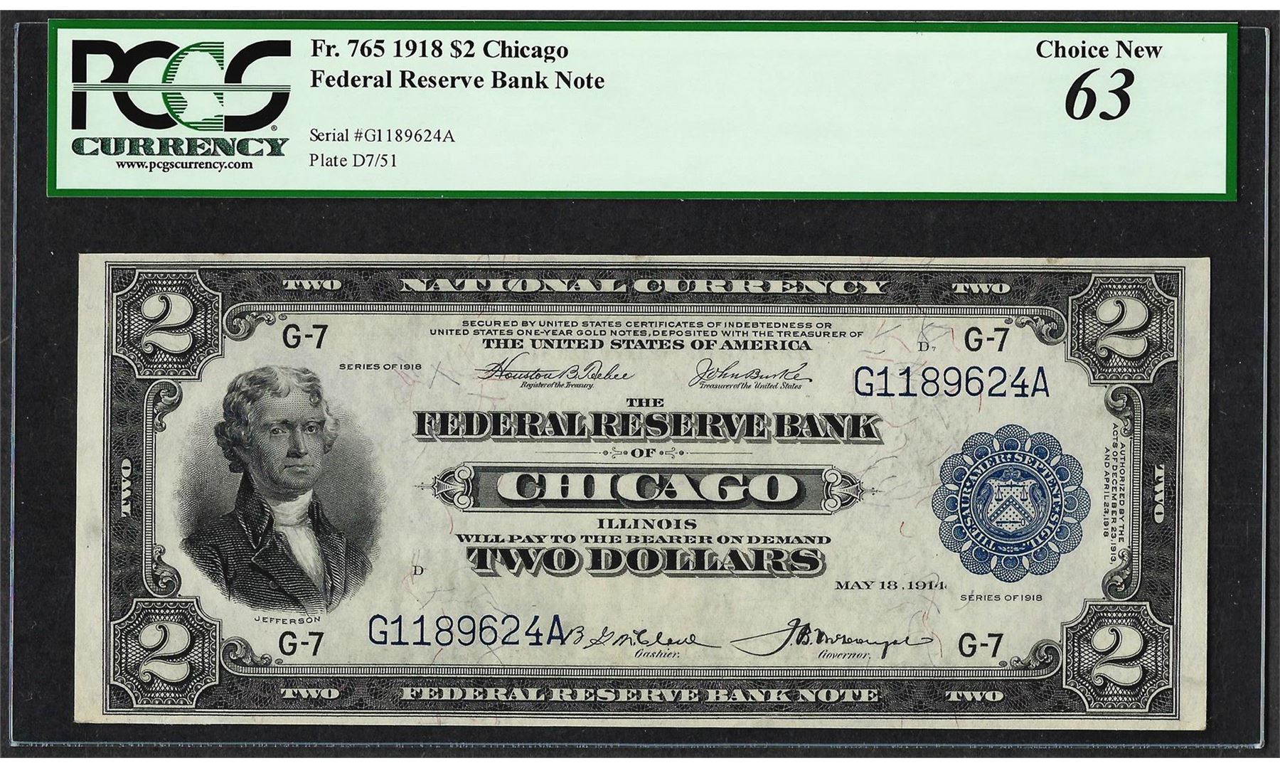 One 1918 $2 Battleship Federal Reserve Note Chicago Fr.765 PCGS Choice New 63. PCGS Graded.
