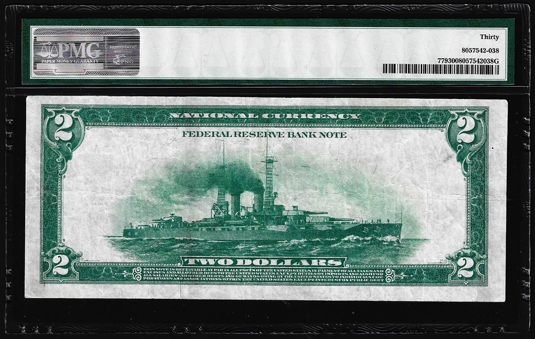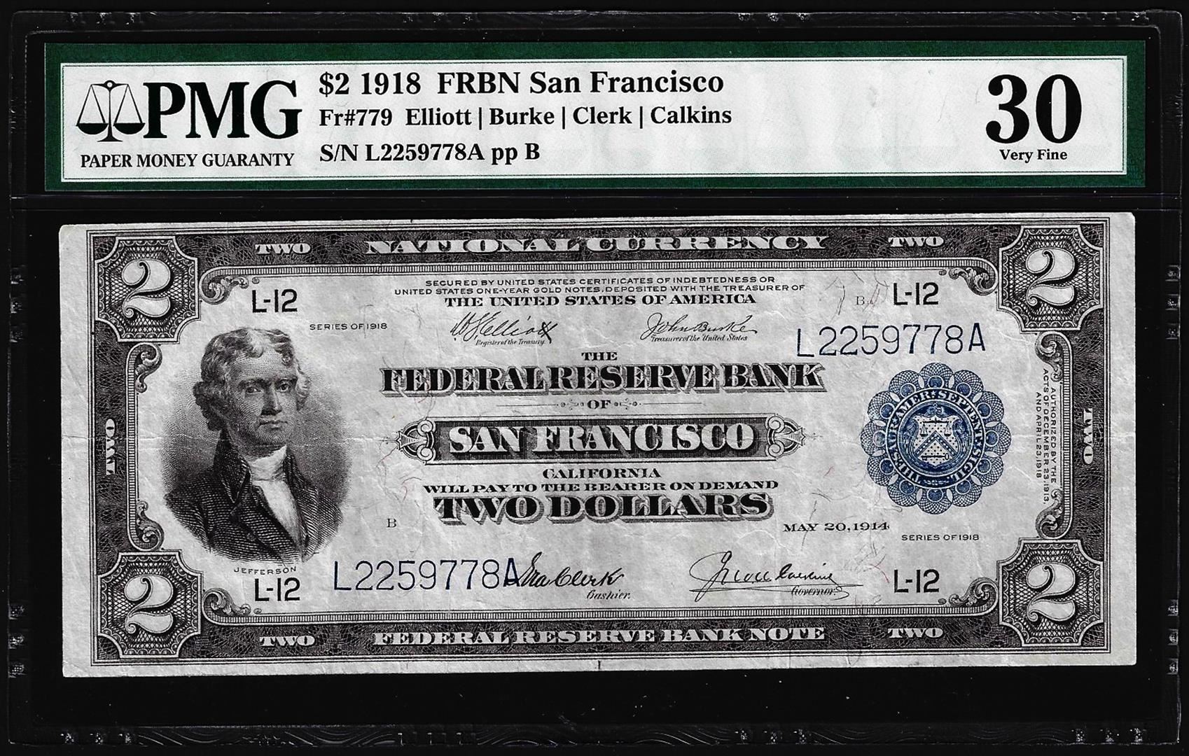 One 1918 $2 Battleship Federal Reserve Note San Francisco Fr.779 PMG Very Fine 30. PMG Certified.