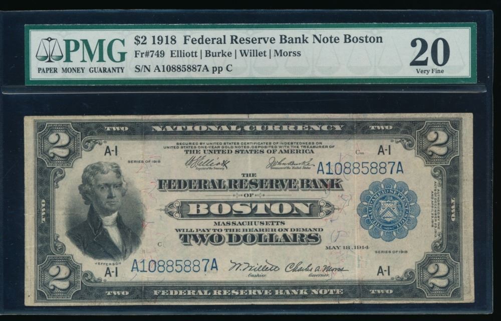 One 1918 $2 Boston FRBN PMG 20.