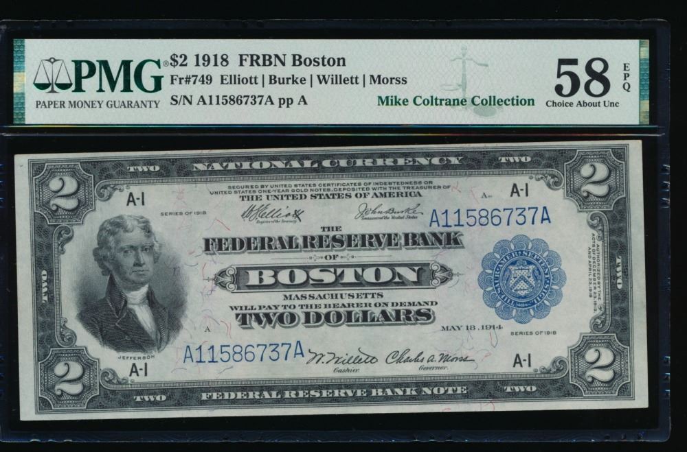One 1918 $2 Boston FRBN PMG 58EPQ.