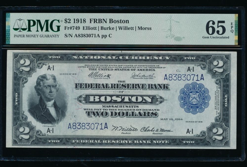 One 1918 $2 Boston FRBN PMG 65EPQ.