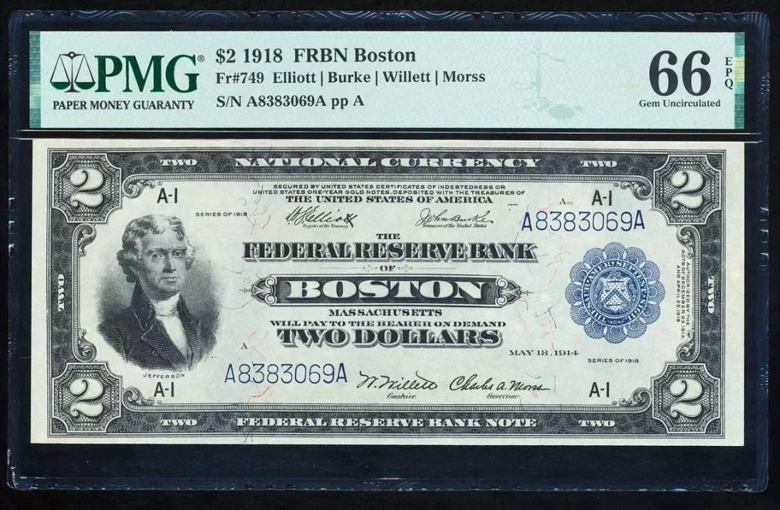 One 1918 $2 Boston FRBN PMG 66EPQ.