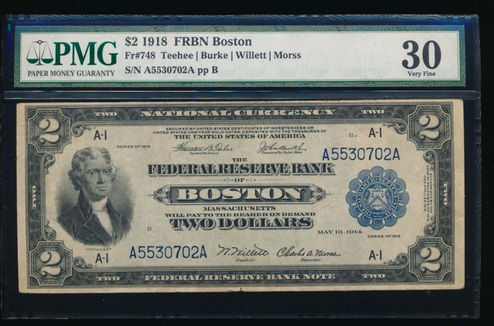 One 1918 $2 Boston Federal Reserve Bank Note PMG 30.