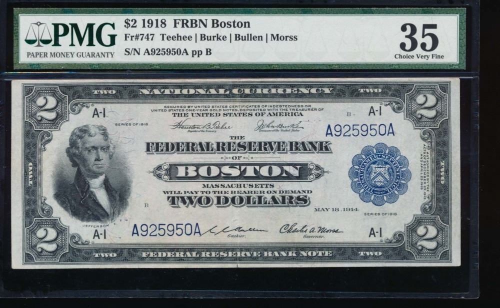 One 1918 $2 Boston Federal Reserve Bank Note PMG 35.