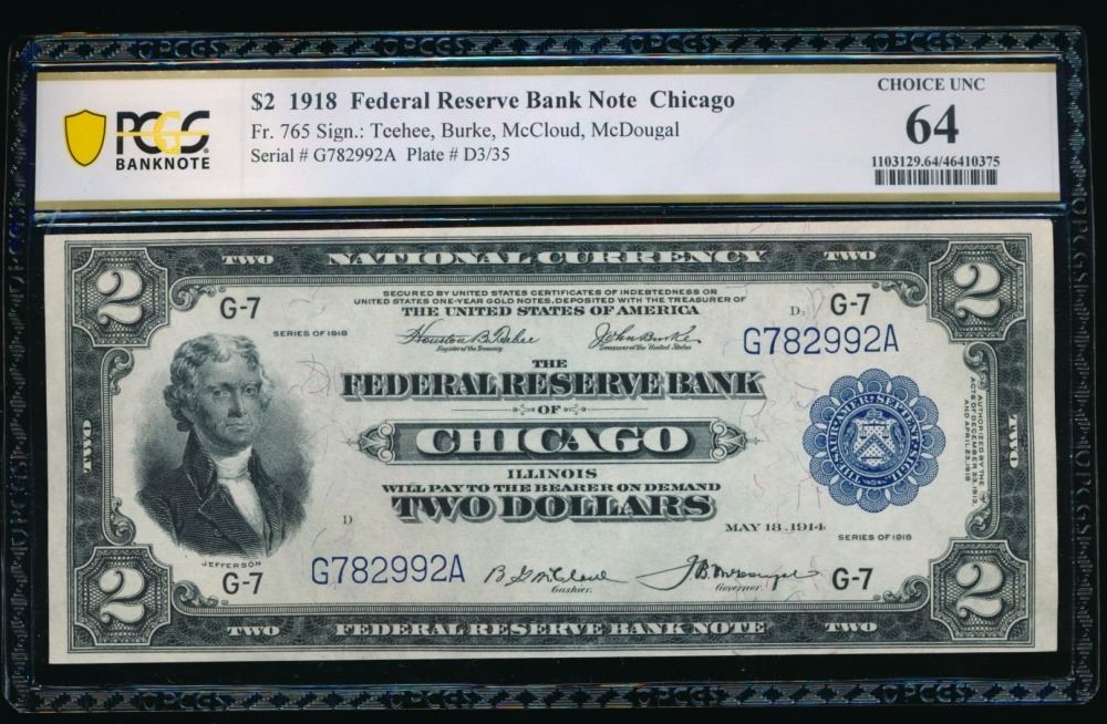 One 1918 $2 Chicago FRBN PCGS 64.